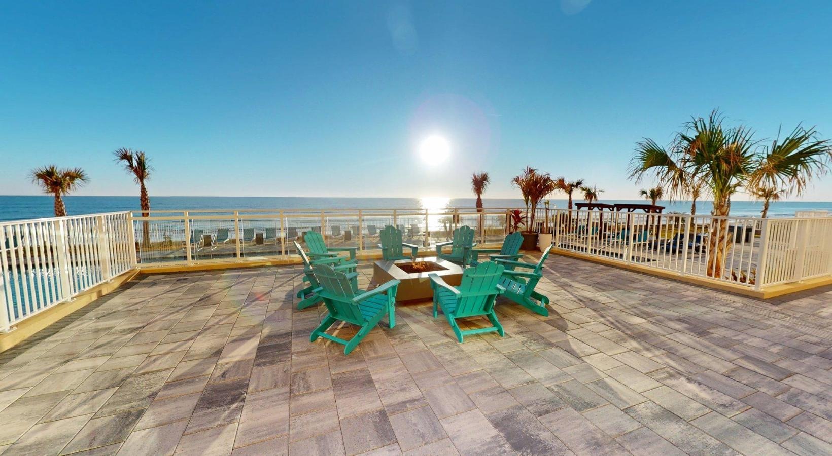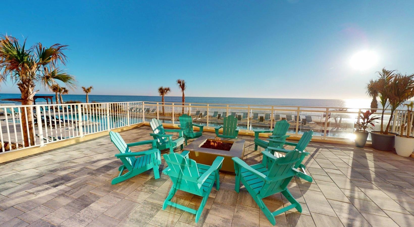 a fire pit area with chairs