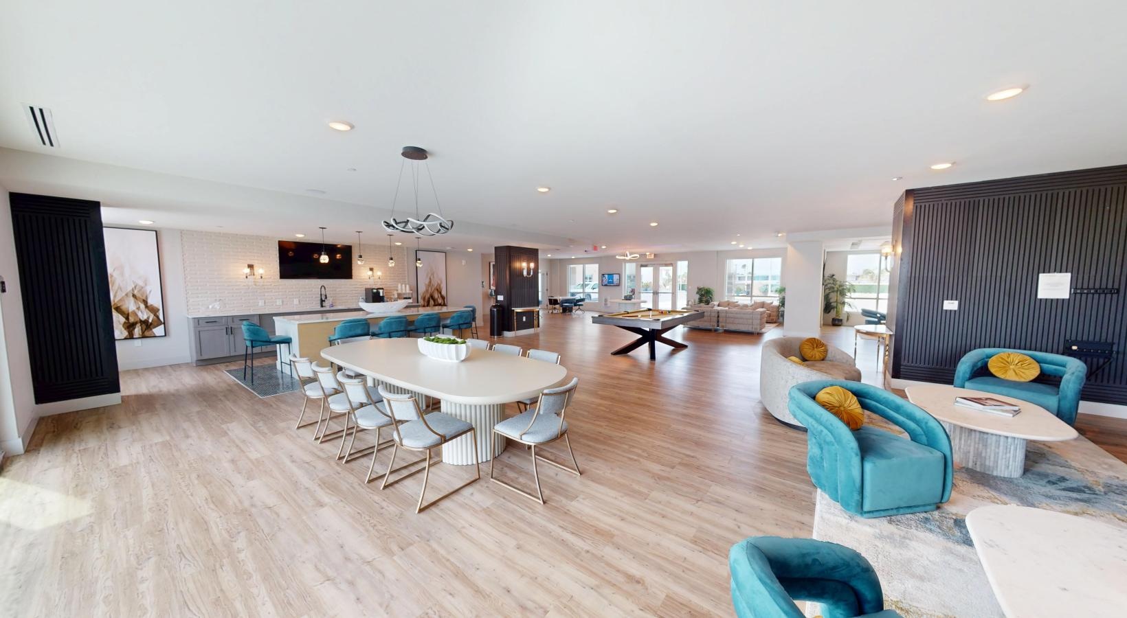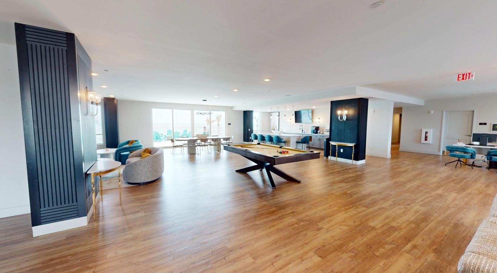 • a clubroom with a pool table and chairs