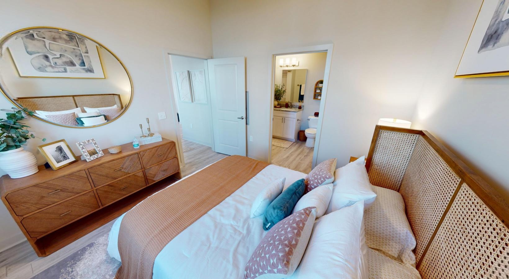 • a bedroom with a bed and a mirror